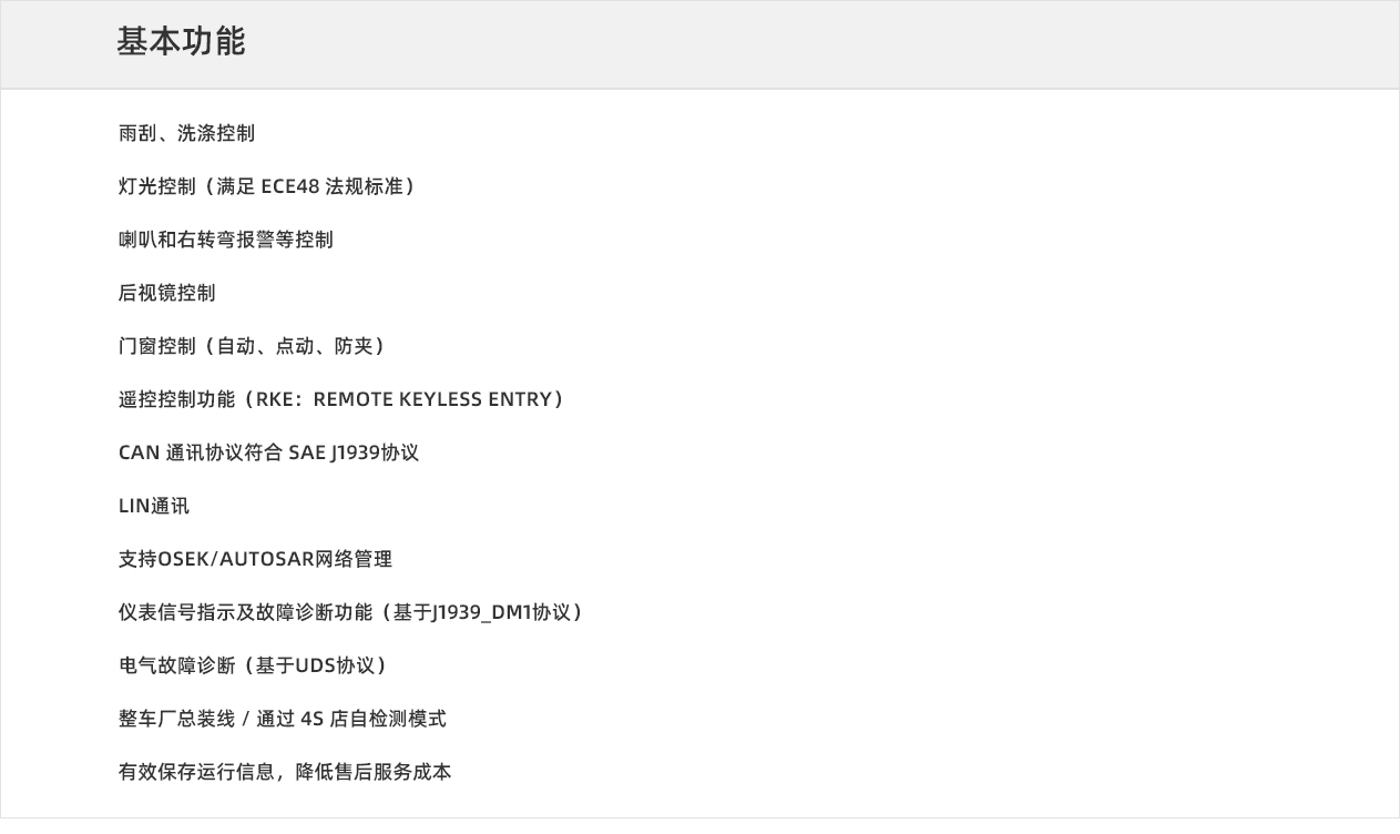 作为国内设计、生产商用车车身网络控制器的供应商,推出分布式网络控制方案,实现整车的灯光、雨刮、门窗等电气控制。整套产品目前已经随整车出口到欧洲、中东地区,现已为一汽解放、中国重汽、陕汽重卡、东风柳汽、江淮、华菱、江铃、三一、宇通、北奔、厦门金龙、Navistar、DAF、MAN、PACCAR 等进行配套。