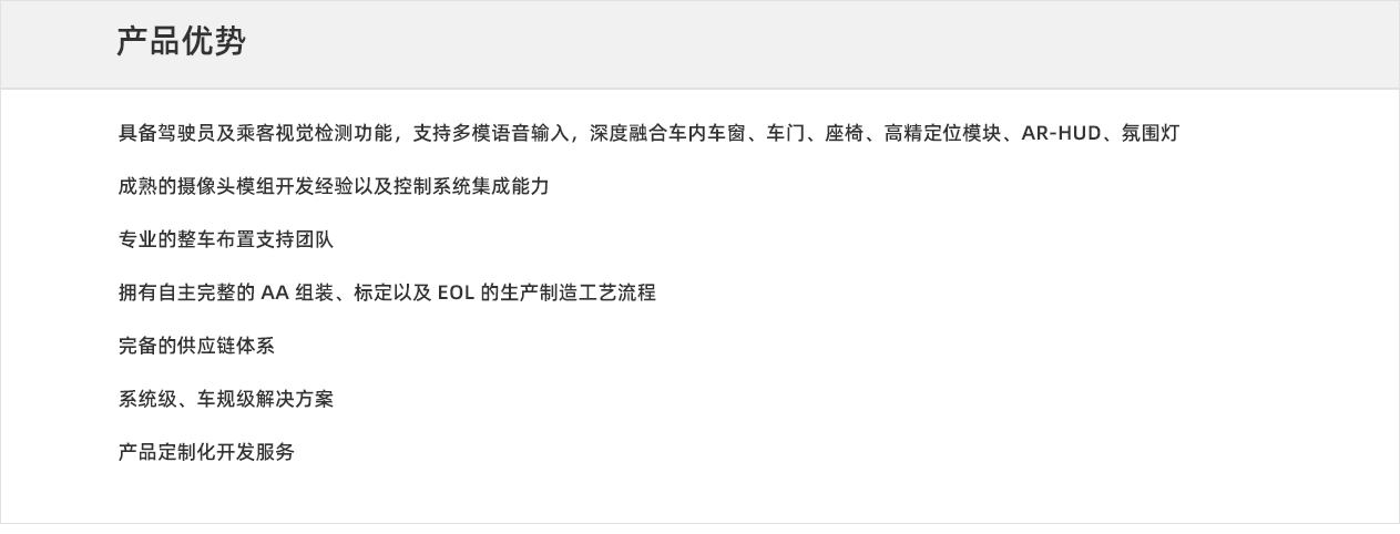 智能座舱系统级解决方案具备感知能力、呈现能力和处理能力,包含摄像头模组、麦克风、活体检测(毫米波雷达)、 氛围灯、流媒体后视镜、增强现实抬头显示、智能座椅、域控制器等部件,可深度融合 ADAS、TBOX、车身、高精地图等 信息,打造一体化智能座舱解决方案。