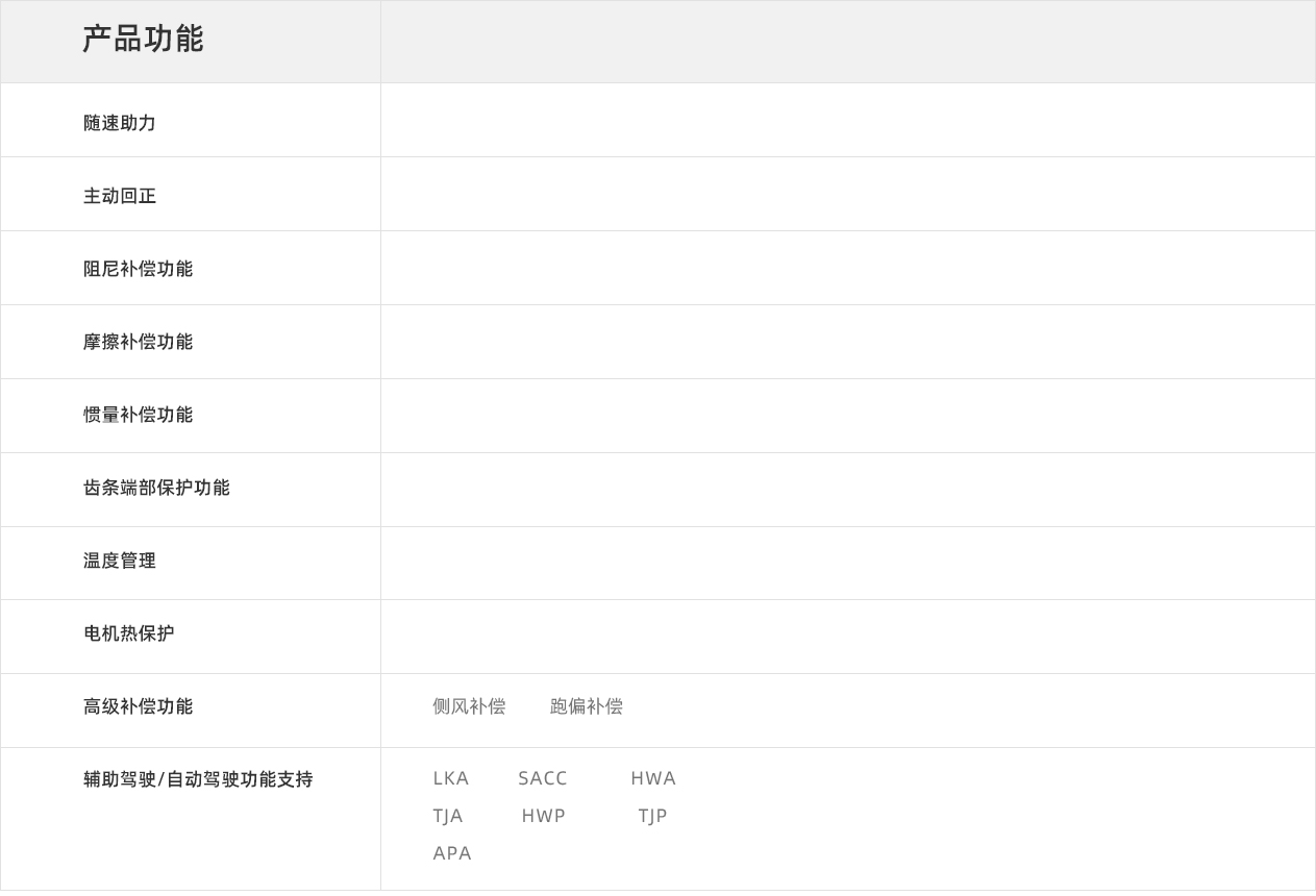 电动助力转向控制器,包括有刷电机的EPS和无刷电机的EPS,产品类型包括分体式和PowerPack两种类型,功率范围涵盖220W至900W,支持的转向系统类型包括管柱式C-EPS、齿条式R-EPS、双小齿轮式DP-EPS,现已给国内外多名主流厂商提供配套产品与服务。
